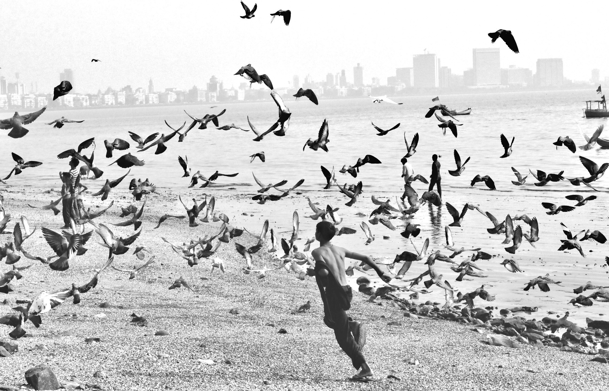 Boy and birds on the beach. Mumbai, Maharashtra, India 2017.