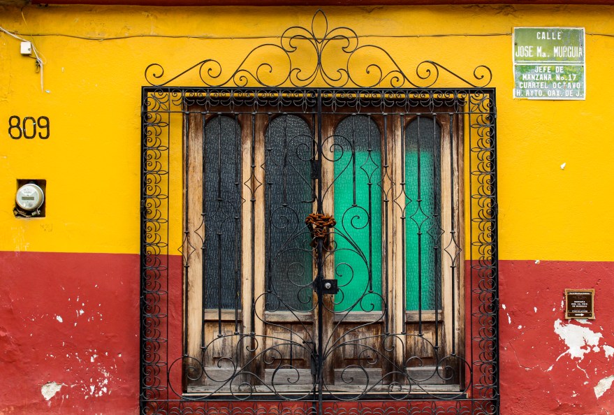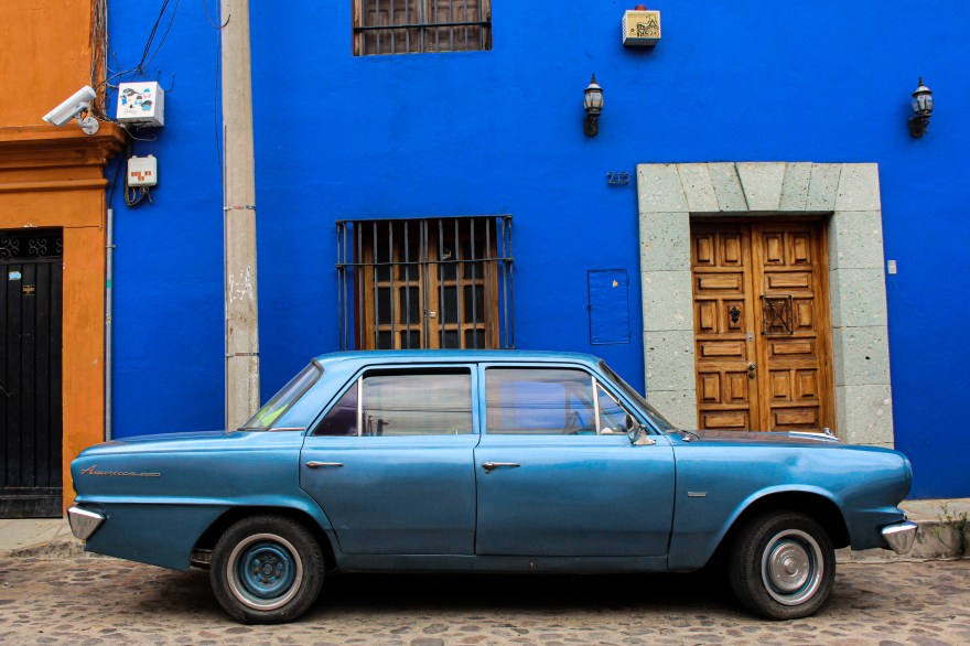 Colorful walls and cars in Oaxaca, Mexico, July 2022.